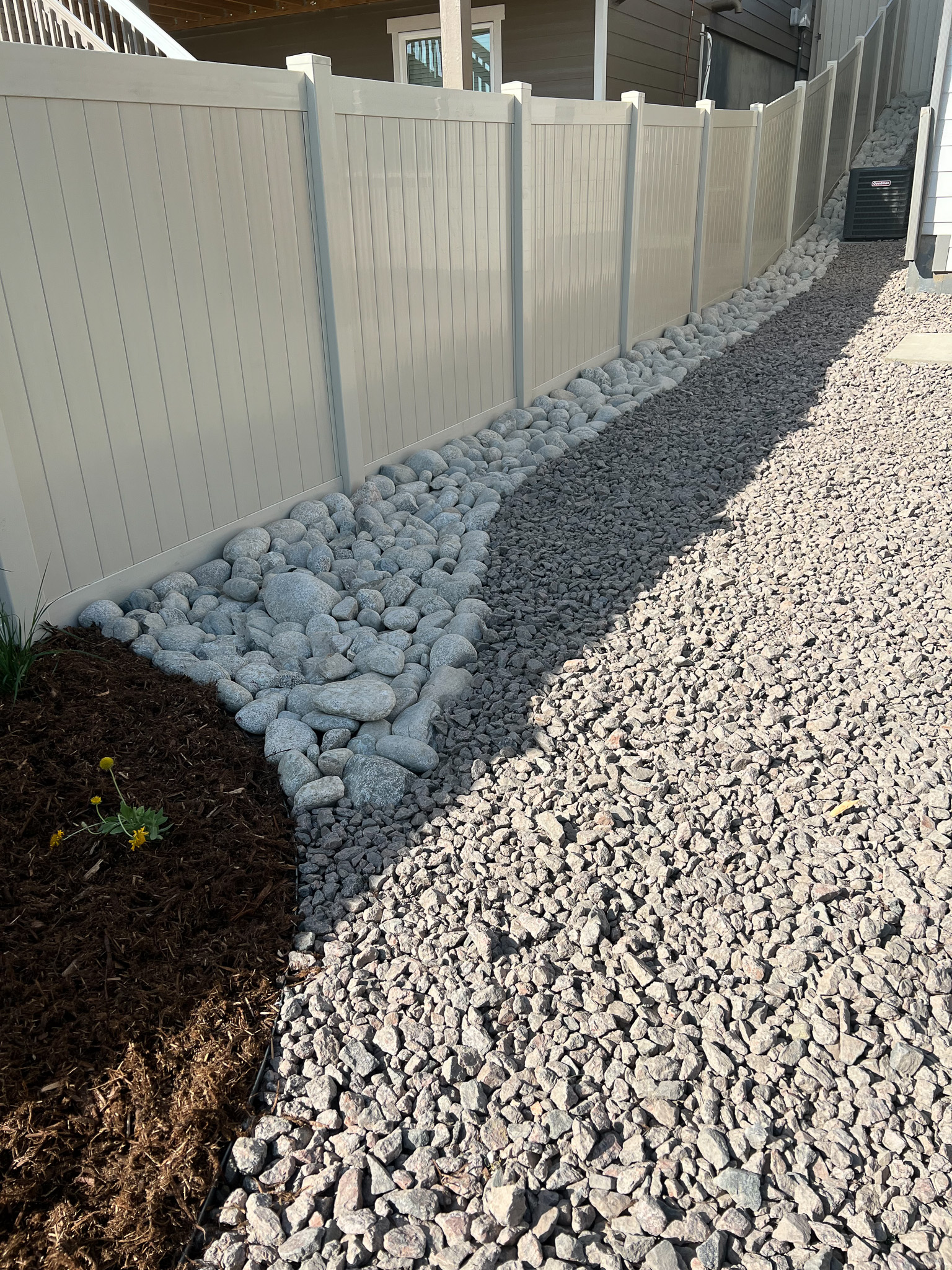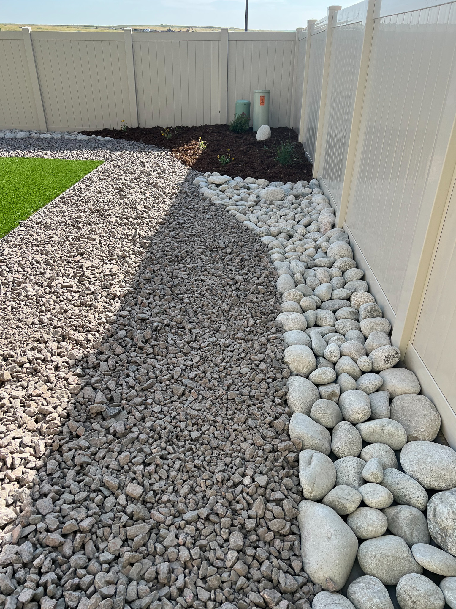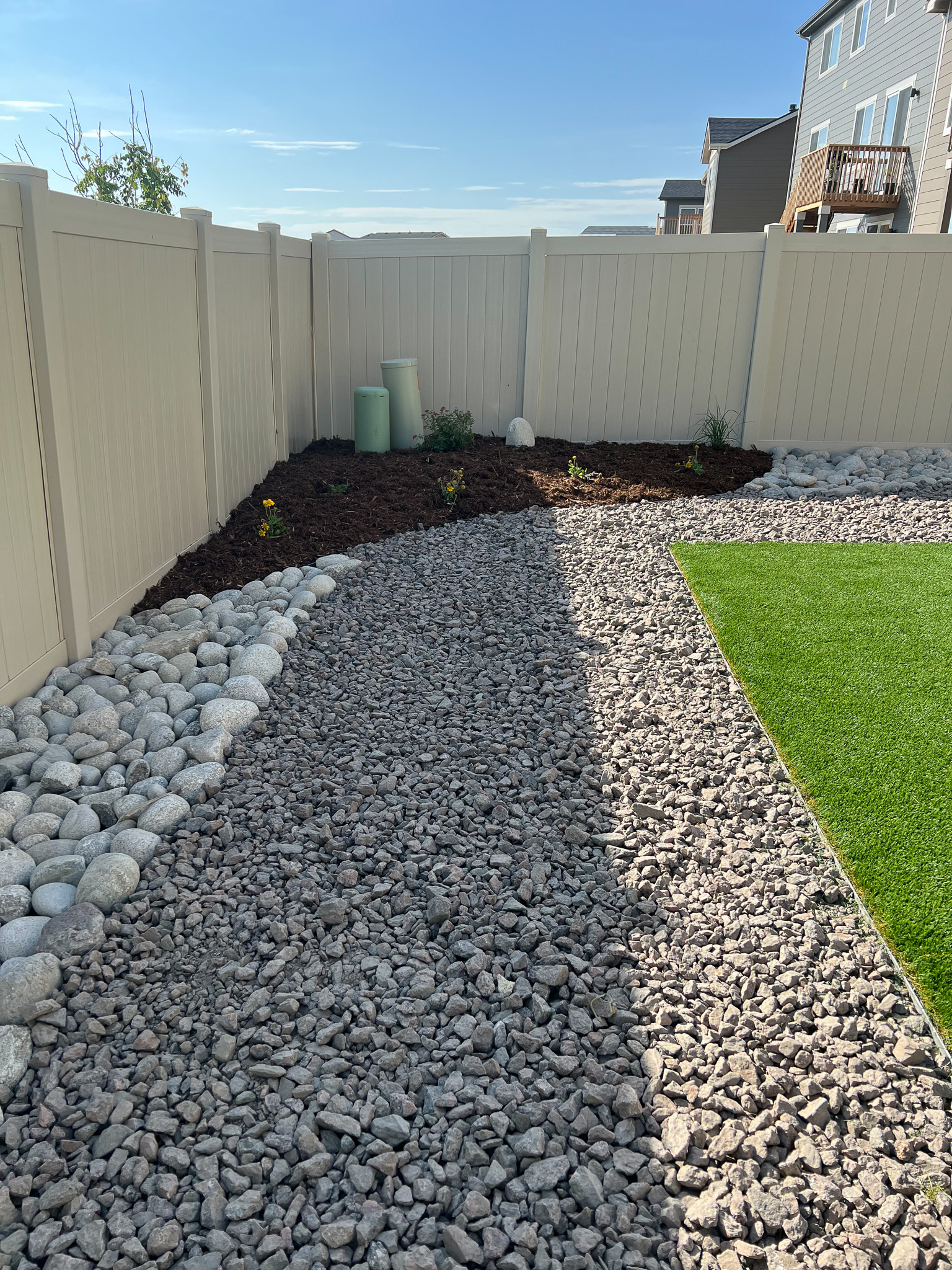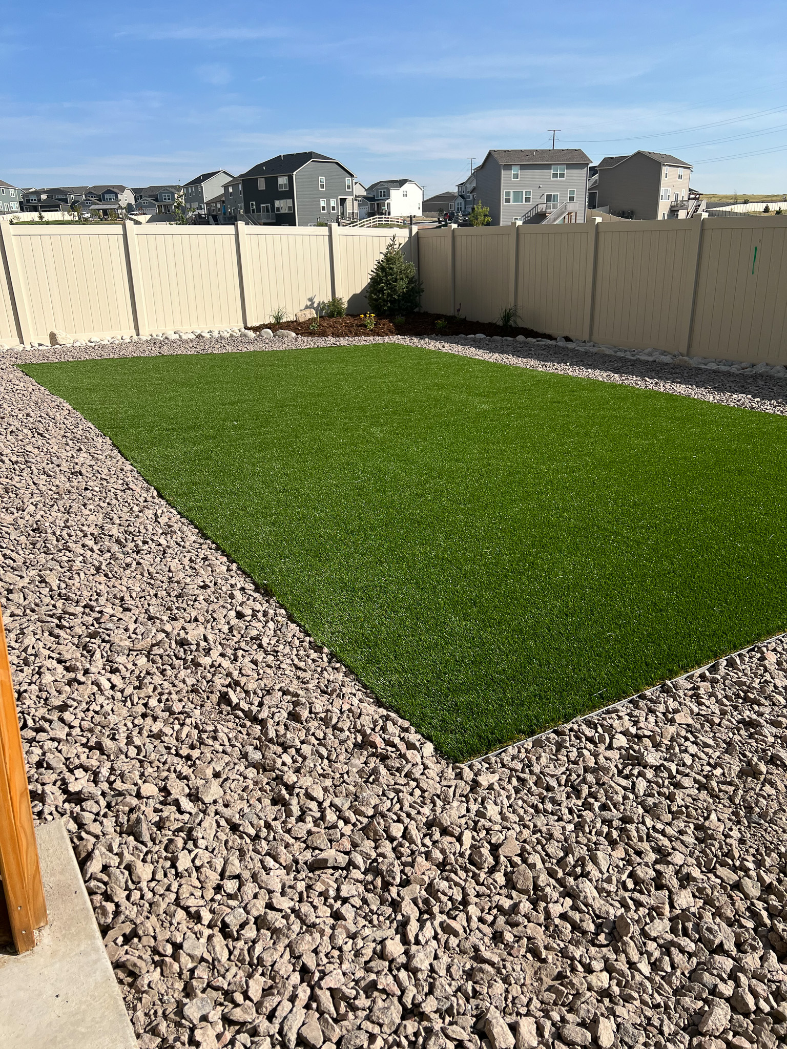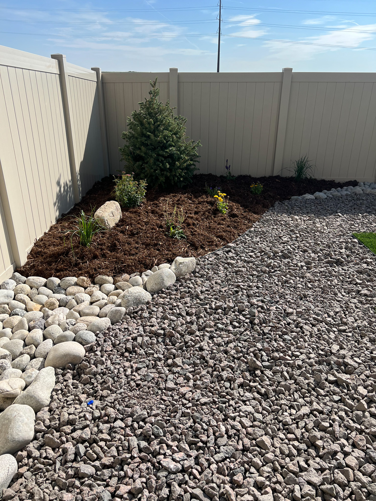 For this project, the challenge was simple; a large play area with low maintenance satisfying HOA requirements. A blue SpruceĀ Tree installed in the corner will ensure lots of shade for years to come.